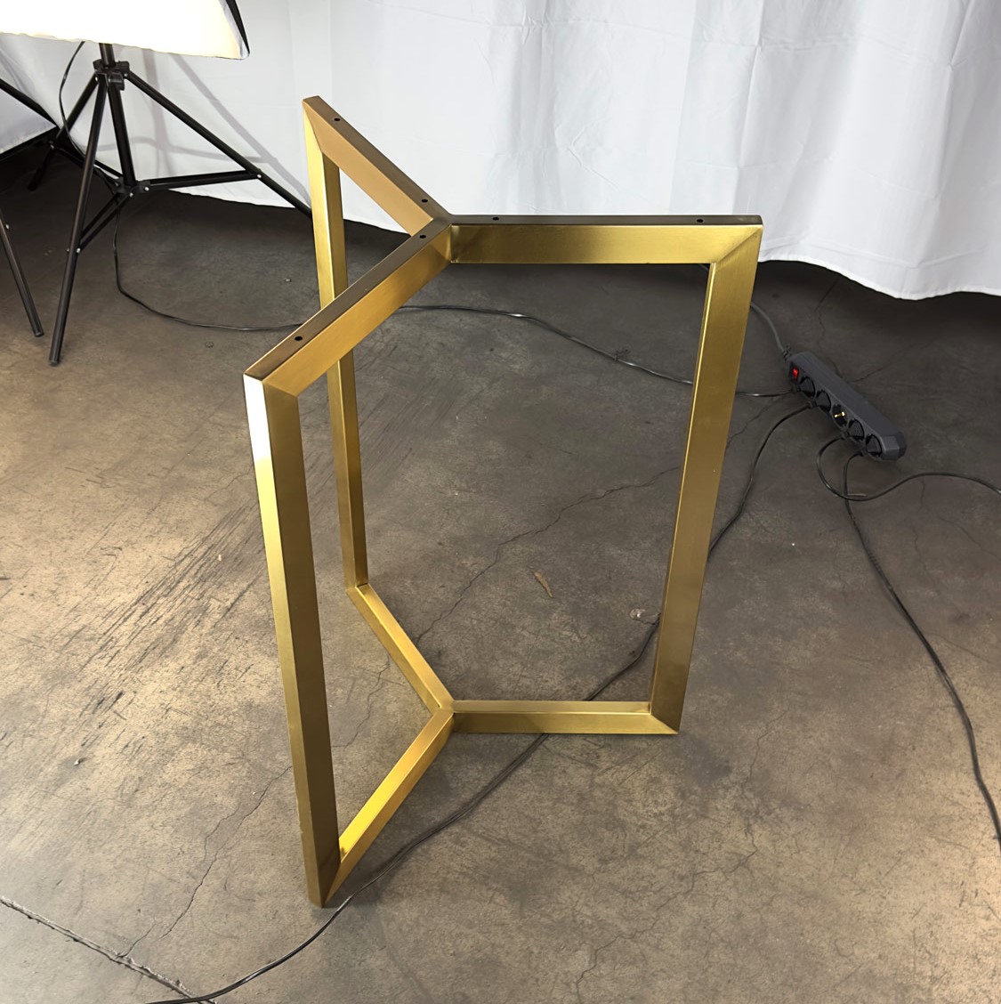 Нестандартное треугольное подстолье с золотым покрытием (52 см сторона) обеспечивает устойчивость столешницам Ø60 см. Уникальный дизайн и премиальное покрытие делают его заметным элементом интерьера.